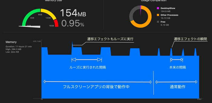 短期間で一定の成果が上がったのと、それができるだけ速やかにリリースしたほうがいい内容だったため、予定外の緊急リリースです。当初考えていたスレッドまわりの見直しというのは、要はトランジションのアニメーションを非同期に行いたいためですが、CoreAnimationを使う限り、最初からレイヤのプロパティ設定ひとつで非同期描画をしてくれること、また仮想デスクトップ(Spaces)への対応もAppKitにその振る舞いを定義するプロパティがあり、それらを設定すれば目的の動作が実現できることがわかったためです。正直これらのことを知らずに今までのバージョンをリリースしていたのが痛恨の極みで、穴があったら入りたい気分です。また今回のバージョンで、他のアプリがフルスクリーン動作している時は壁紙切替の進行を止めるようにしました。というのもCIFilterを使ったモーフィング系のトランジシヨンが裏で走らせるにはリソース消費が無視できないものだったためです。私の使用環境(Core i7 6コア 2.2GHz)で、CUP負荷がシングルコア換算で70%前後、メモリ使用量が2.5Kモニタでも100MBくらい消費しますので、流石に止めないとまずいと思いました。CoreAnimationを使ったもののリソース消費は微々たるものなんですが。