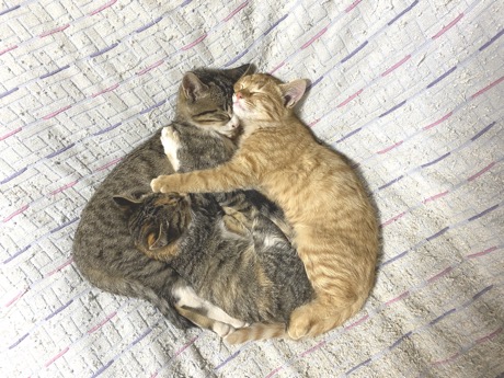 ベッドに飛び乗って遊ぶことを覚えて以来、ずっとベッドの上で寝てた猫二匹が、今夜初めて押し入れのクッションの上で寝てます。体が大きくなって同じベッドで寝るのことに窮屈な思いを感じてたのは飼い主だけじゃなかったのでしょうか。